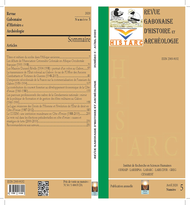 Le cinquième numéro d’HISTARC paraît dans un contexte mondial marqué par la pandémie du Covid-19 (maladie induite par SARS-CoV-2) dont les symptômes sont principalement la fièvre, la toux et une difficulté respiratoire. Au moment où nous écrivions ces mots, cette maladie avait déjà malheureusement entraîné 66 542 décès dans le monde (https://news.google.com/covid19/map, le 05/04/2020 à 17h29mn). Sa rapidité de propagation et ses conséquences ont amené plusieurs États à confiner leurs populations à leurs domiciles et à ordonner la fermeture de musées, bibliothèques, centres d’archives, etc. ; tous essentiels à la recherche scientifique. Ces interdictions d’accès physiques aux corpus ont toutefois permis une ouverture plus large « online » au public et aux chercheurs de bases de données de plusieurs bibliothèques et mussées dans le monde. Certains d’entre eux ont limité cet accès à trois mois. Nous espérons plutôt que cet accès excédera cette période et qu’il sera pérennisé dans le temps, tout au moins pour les chercheurs. Le présent numéro compte dix contributions couvrant des champs allant de l’histoire ancienne à l’histoire contemporaine. Abordant plusieurs périodes (Antiquité, coloniale, coloniale/postcoloniale, postcoloniale), toutes ces contributions éclairent un peu plus l’histoire de l’Afrique, continent que des observateurs, soi-disant avertis, vouent à une perdition totale au crépuscule de la pandémie du Covid-19. Le premier article est une étude synchronique du rôle déterminant de scribe durant la période pharaonique, enrichie et renforcée par la relation avec une Afrique noire dite « anhistorique » et « sans écriture ». Mouhamadou Nissire Sarr (Département d’Histoire, Université Cheikh Anta Diop, Dakar-Sénégal) évalue le rapport entre le scribe et la divinité en examinant le scribe comme Maître du trésor royal, archiviste et prêtre lisant la liste d’offrandes. Le deuxième article interroge la question du coton au début du XXe siècle dans les relations commerciales internationales au travers de l’Association Cotonnière Coloniale en Afrique-Occidentale française. Tanoh Raphaël Bekoin (Département histoire, Université Alassane Ouattara, Côte d’Ivoire) s’intéresse principalement aux moyens dont dispose cette association pour développer le coton dans toutes les colonies françaises. Par ce biais, l’auteur met en lumière les circonstances de création de cette association d’industriels, d’intermédiaires et de groupes de pression de tout genre ; ses stratégies d’action et ses premières actions. Le troisième article établit le portrait d’un colon au Gabon, notamment celui de Luc Maurice Durand-Réville (1904-1998). Simplice Vianney Mouanga (IRSH-CENAREST, Gabon) s’exhorte à mettre en avant l’étendue de l’empreinte de Luc Maurice Durand-Réville sur le Gabon colonial et postcolonial. Le quatrième article porte sur transmission des institutions de l’État colonial français aux anciennes colonies d’Afrique déclarées indépendantes en 1960 pour la plupart d’entre elles. Léon Modeste Nnang Ndong (Département d’Histoire et Archéologie, Université Omar Bongo, Gabon) s’intéresse particulièrement au cas du Gabon, en s’appesantissant sur l’Office des Anciens Combattants et Victimes de Guerres (1948-2013). Il relève les conditions et les modalités du passage de cet Office colonial à une structure à gestion commune conventionnée, puis à un service public national gabonais. Le cinquième article met en exergue l’empreinte néocoloniale de la France sur le commerce des matières premières des pays africains après les indépendances, en particulier la commercialisation de l’uranium du Gabon entre 1959 et 1994. Selon Robert Edgard Ndong (IRSH/CENAREST, Gabon), des instruments contractuels et commerciaux (URANEX) établissent cette emprise néocoloniale. Le sixième article, écrit par Konan Alain Brou et Samuel BOKA (UFR des Sciences de l’Homme et de la Société, Université Félix Houphouët Boigny d’Abidjan, Côte d’Ivoire), fait ressortir la contribution de la forêt dans l’essor économique de la Côte d’Ivoire de 1960 à 1980 et les actions menées par l’État pour sa préservation. Le septième article, de Sidina Noël Mvou Kounta (LAM — Les Afriques dans le monde, UMR 5115, Sciences Po Bordeaux, France), revisite la formation et la gestion des élites militaires au Gabon au cours des trente premières années (1960-1990) suivant l’indépendance. Il contribue à mettre en lumière les conditions complexes de la transmission des institutions militaires françaises en Afrique centrale. Le huitième article s’attarde sur la Ligue ivoirienne des Droits de l’Homme et l’évolution de l’État de droit en Côte d’Ivoire de 1987 à 2012. Nahoua Karim Silue (Département d’Histoire, Université Alassane Ouattara, Bouaké, Côte d’Ivoire) met en relief les actions de cette ligue qui concourent avec la quête continue de la Côte d’Ivoire vers un État de droit. Le neuvième article met en lumière le problème de leadership des sociétés musulmanes africaines en interrogeant la place du Conseil Supérieur des Imams en Côte d’Ivoire. Comment ce Conseil s’est-il érigé en principal interlocuteur de la communauté musulmane en Côte d’Ivoire alors qu’il était traversé par des mutations internes et externes profondes entre 1988 et 2019 ? Drissa Kone (Département d’Histoire, Université Félix Houphouët-Boigny/Abidjan, Côte d’Ivoire) révèle les stratégies de positionnement de cette structure islamique dans une atmosphère de mutations sociales et politiques. Le dernier article, œuvre de Katiénéffooua Adama Ouattara (Université Félix Houphouët-Boigny Abidjan - Cocody, Côte d’Ivoire), aborde les causes et les stratégies de lutte du vote nul dans les élections présidentielles en C